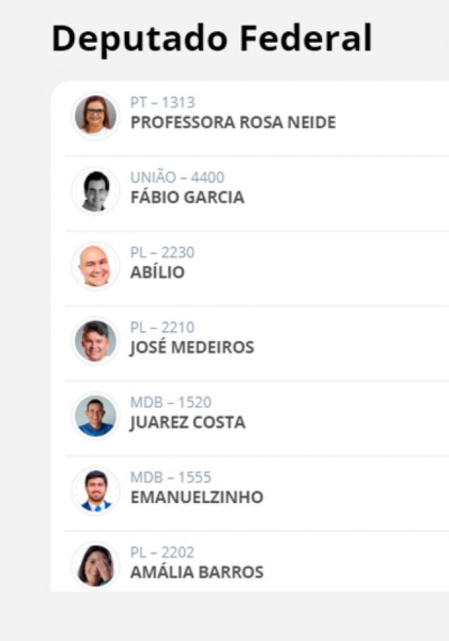 Seguido de Rosa Neide, Fábio Garcia (União Brasil) recebeu 96.334 votos. No último lugar do pódio dos mais votados, Abílio Júnior (PL) recebeu 86.113.