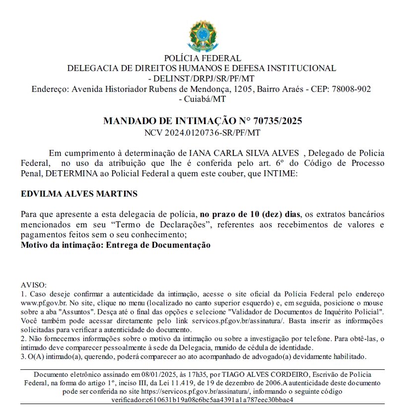 A delegacia de Direitos Humanos e Defesa Institucional expediu um mandado para que Edvilma entregue extratos bancários detalhando movimentações financeiras potencialmente realizadas sem seu conhecimento, dentro de um prazo de dez dias.